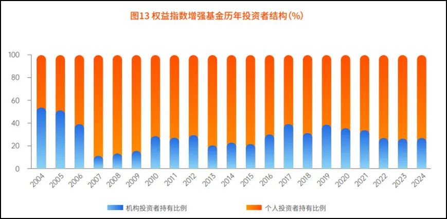 讲演表现,往常20年,指数增强基金的投资者结构相对领路,机构投资者占比约为三成,个东说念主投资者占比约为七成。近3年,机构投资者平均占比为26.78%,个东说念主投资者平均占比为73.22%。不外,在2007年—2008年、2014年—2015年的高潮市中,个东说念主投资者加快入市,握有职权指数增强基金的比例赞助。近几年,指数增强基金的握有东说念主户数又在徐徐增长,反应出中小投资者对指数增强基金的眷注和招供。